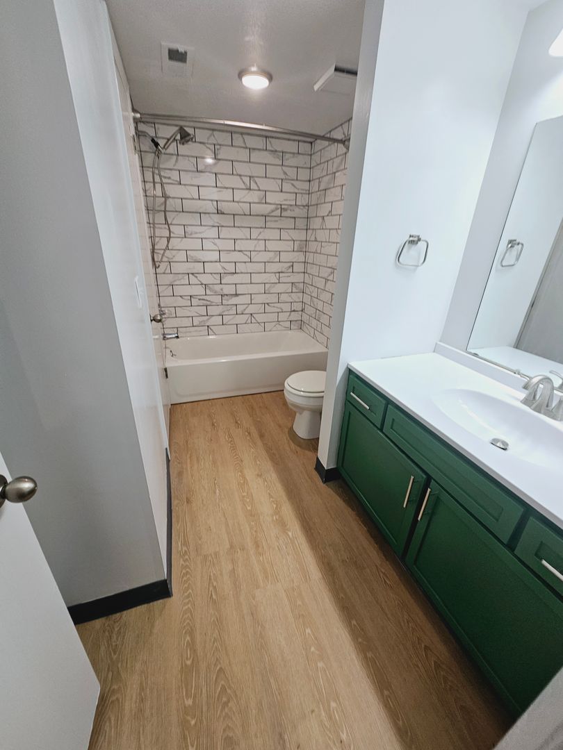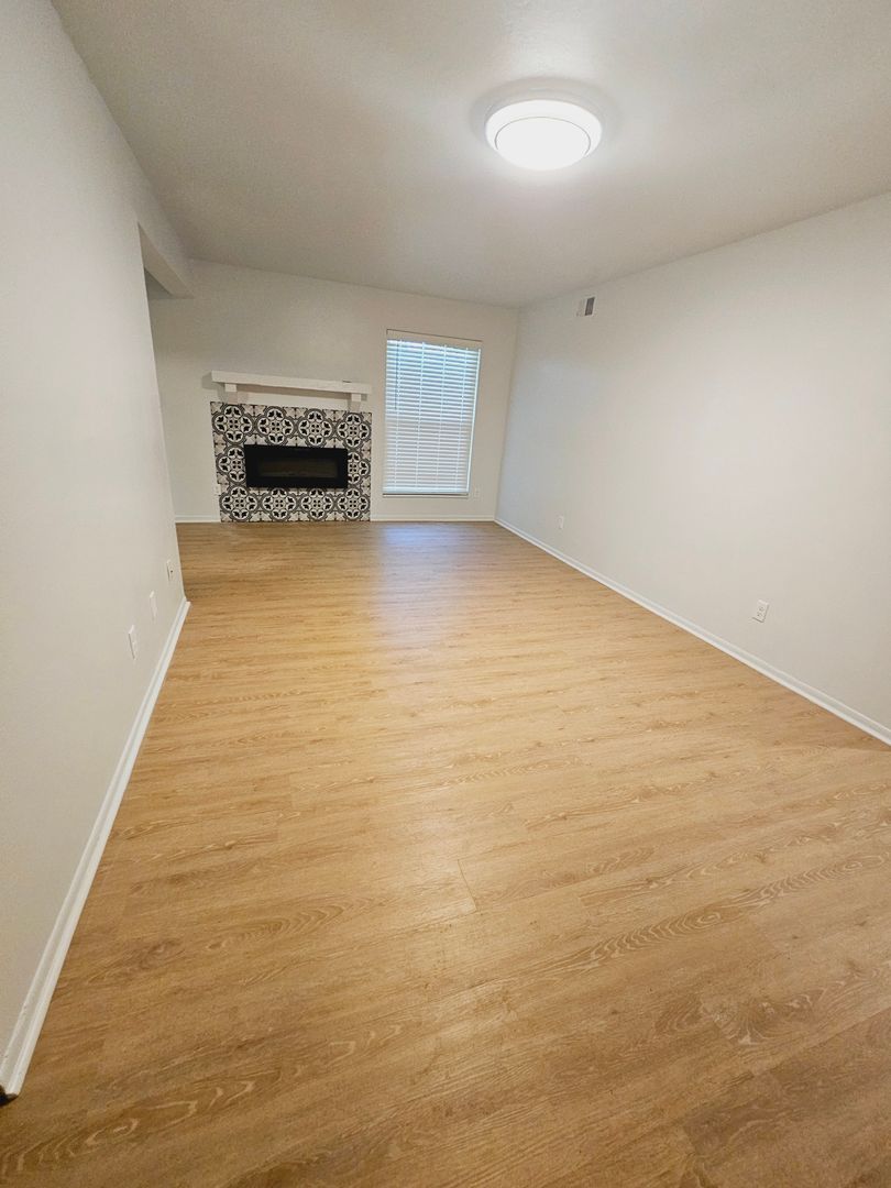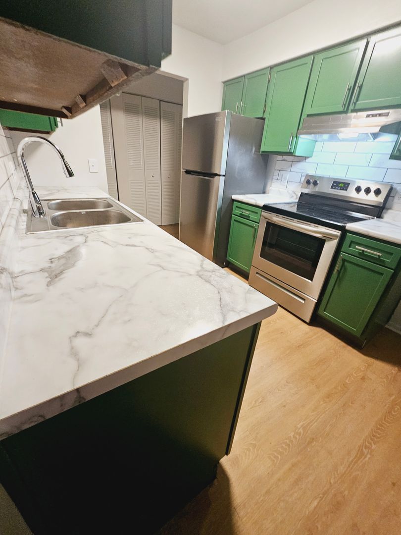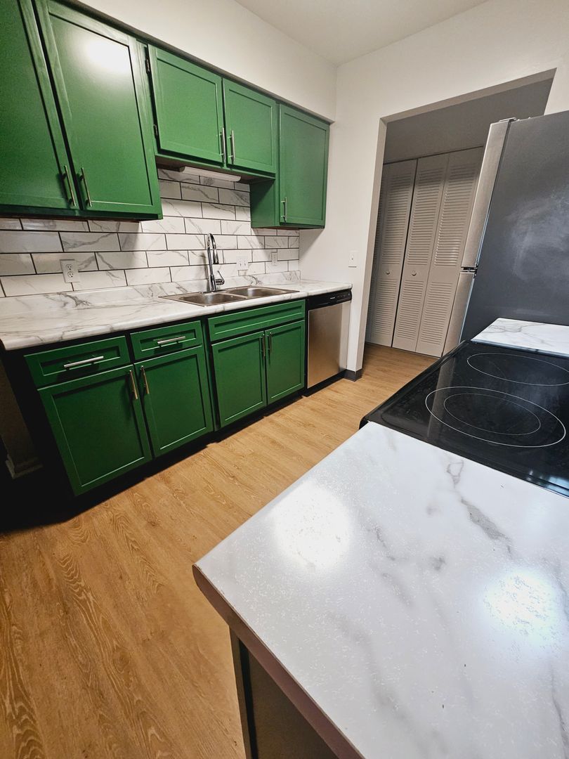 2 bedroom 1 bathroom upgrade on the first floor. This apartment has luxury vinyl plank flooring. Green painted cabinets, new laminate counter top, beautiful backsplashes, electronic fireplace, stainless steel appliances, faux wood blinds, ceiling lights in every room, and a remodeled bathroom.